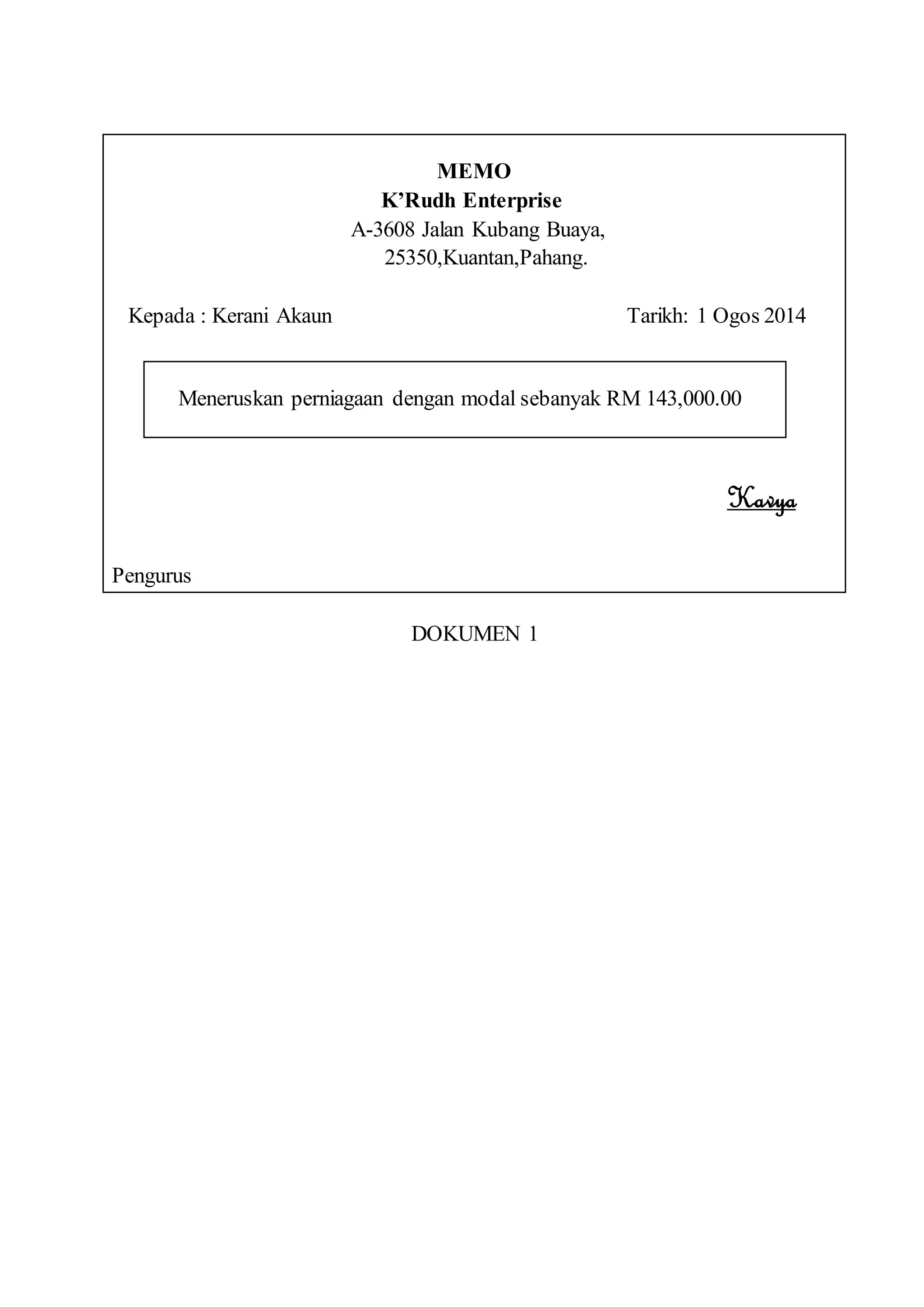 Dokumen 2 dihantar oleh Kedai Buku dan Alat Tulis Rozim kepada pelanggannya. Senario ini wujud semenjak zaman bahasa Melayu kuno dengan dominasi bahasa Sanskrit hinggalah kini pada era bahasa Melayu moden yang disaingi dengan hebat oleh bahasa Inggeris. Jika berlaku kerosakan kerani stor akan melaporkan kepada pengurus pengeluaran untuk membuat pesanan bagi produk baru.
